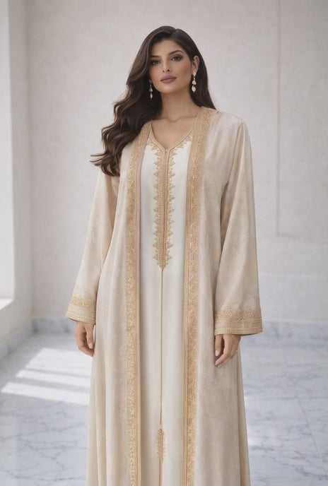 كيمونو كفتان أنيق وفخم بلون بيج ذهبي ناعم ولامع، مع طبقة داخلية بيضاء ناعمة، وتطريز ذهبي مغربي تقليدي دقيق وغني على الصدر والأكمام والحواف. التصميم مفتوح مريح، أكمام واسعة طويلة، يعطي إطلالة ملكية وعصرية في نفس الوقت. مثالي للأعراس، الحفلات، العيد، أو أي مناسبة خاصة تبغي فيها تبرزي بأناقة راقية. قماش مخملي ناعم ومريح، يناسب كل الأجسام ويعطي لوك شيك وفخم.